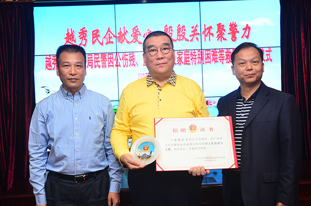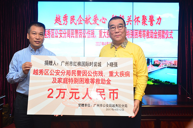 4月12日下午,由越秀區工商聯、越秀區總商會發起并主辦的“越秀民企獻愛心,殷殷關懷聚警力”-越秀區公安分局民警因公傷殘、重大疾病及家庭特別困難等救助金捐款儀式”在海印集團中心國際會議室舉行。卜總代表紅棉國際時裝城為救助基金捐款人民幣2萬元整。