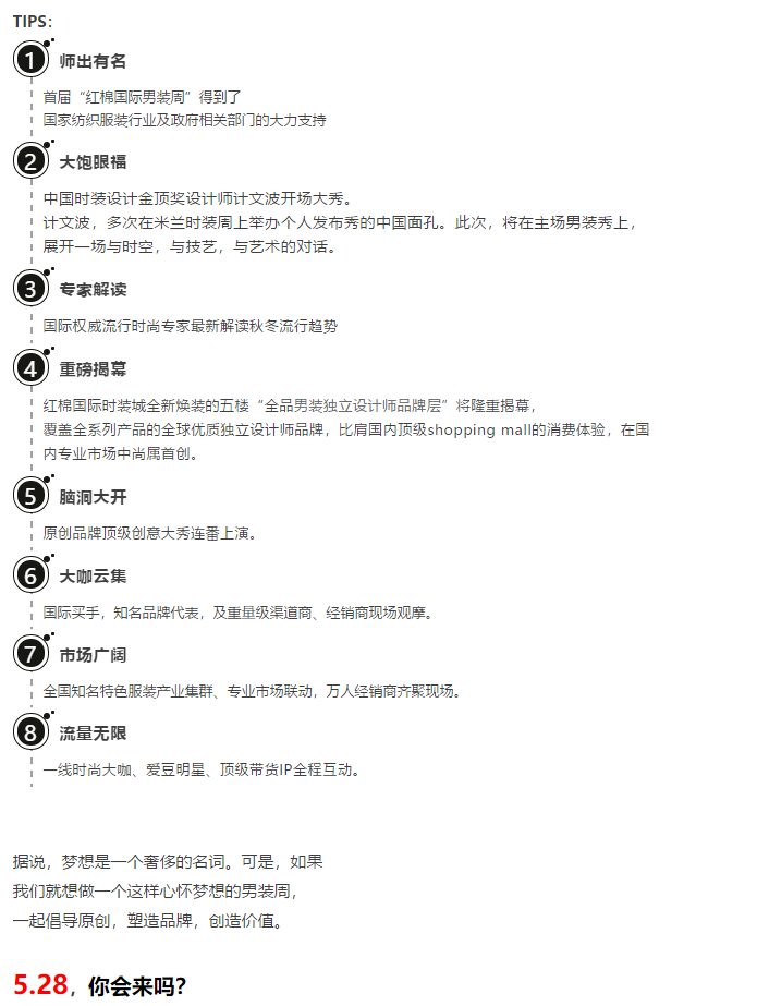 因機遇而匯聚,因集聚而強勢。中國男裝時尚的崛起,勢必需要一個強有力的依托平臺,首屆紅棉國際男裝周的醞釀與誕生,將對中國當前男裝時尚體系產生巨大的推動作用。男裝時尚產業的探索和生態共建,也許就從這里開啟。